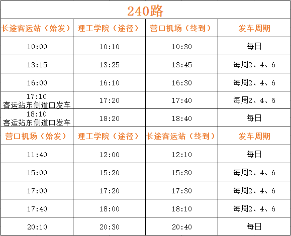 公汽公司從機(jī)場辦公室獲悉:從2017年8月1日起,營口藍(lán)旗機(jī)場開辟“營口—濰坊—西安”新航線。針對上述情況,為方便市民出行,經(jīng)公司研究現(xiàn)提出調(diào)整機(jī)場240路運(yùn)營班次。具體內(nèi)容如下: