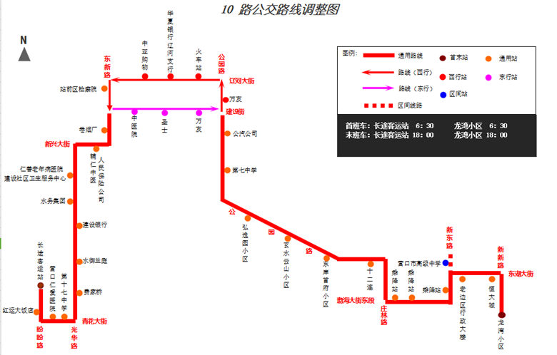 調(diào)整前:“龍灣小區(qū)”—原線—遼河大街/建設(shè)街—原線—盼盼路—“長途客運(yùn)站”。