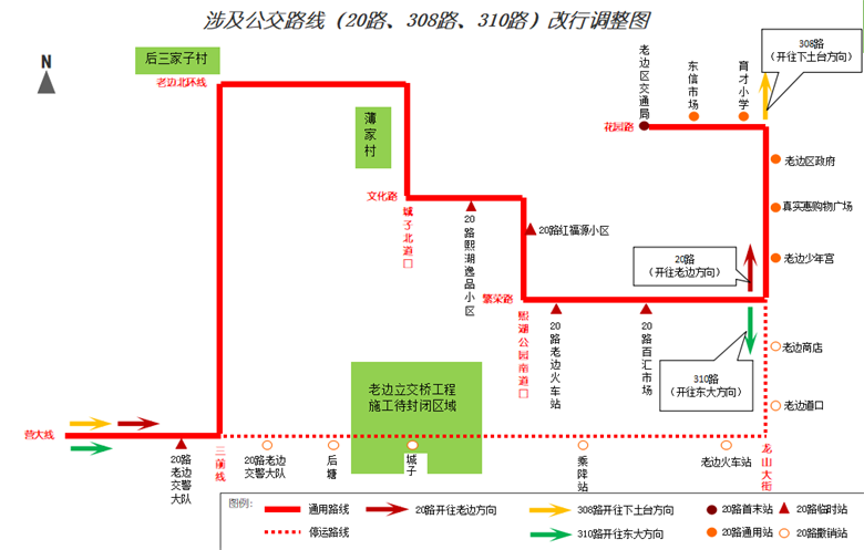 途徑封閉路段參照20路改行路線執(zhí)行,自龍山大街與繁榮路交匯處向北至下土臺歸到原線路運營。